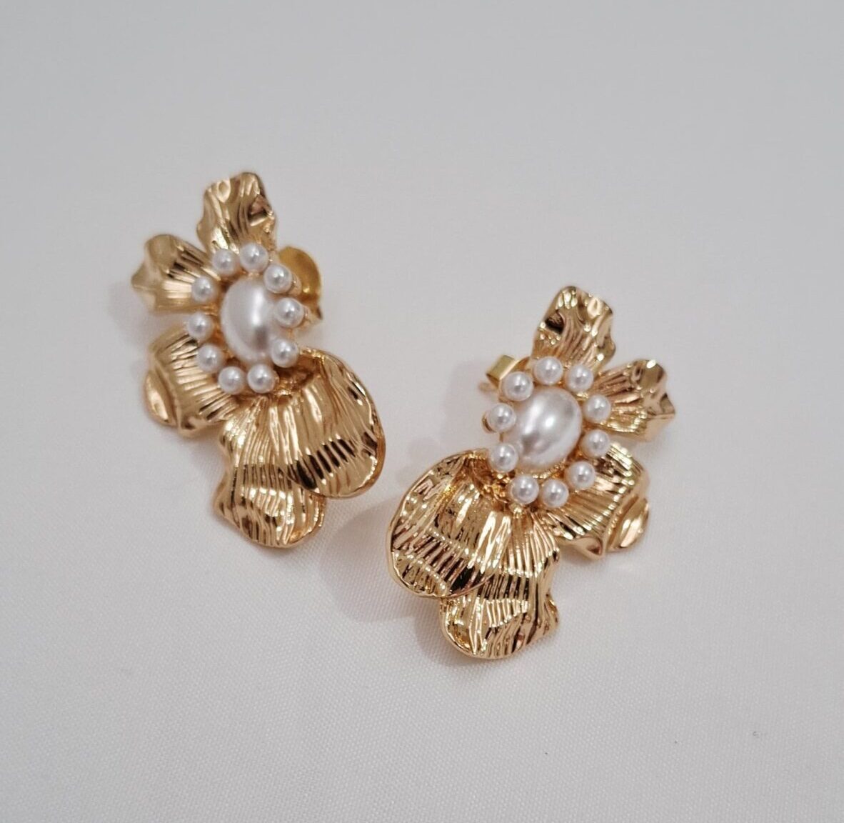 Brinco flor banhado em ouro 18k com pérolas.